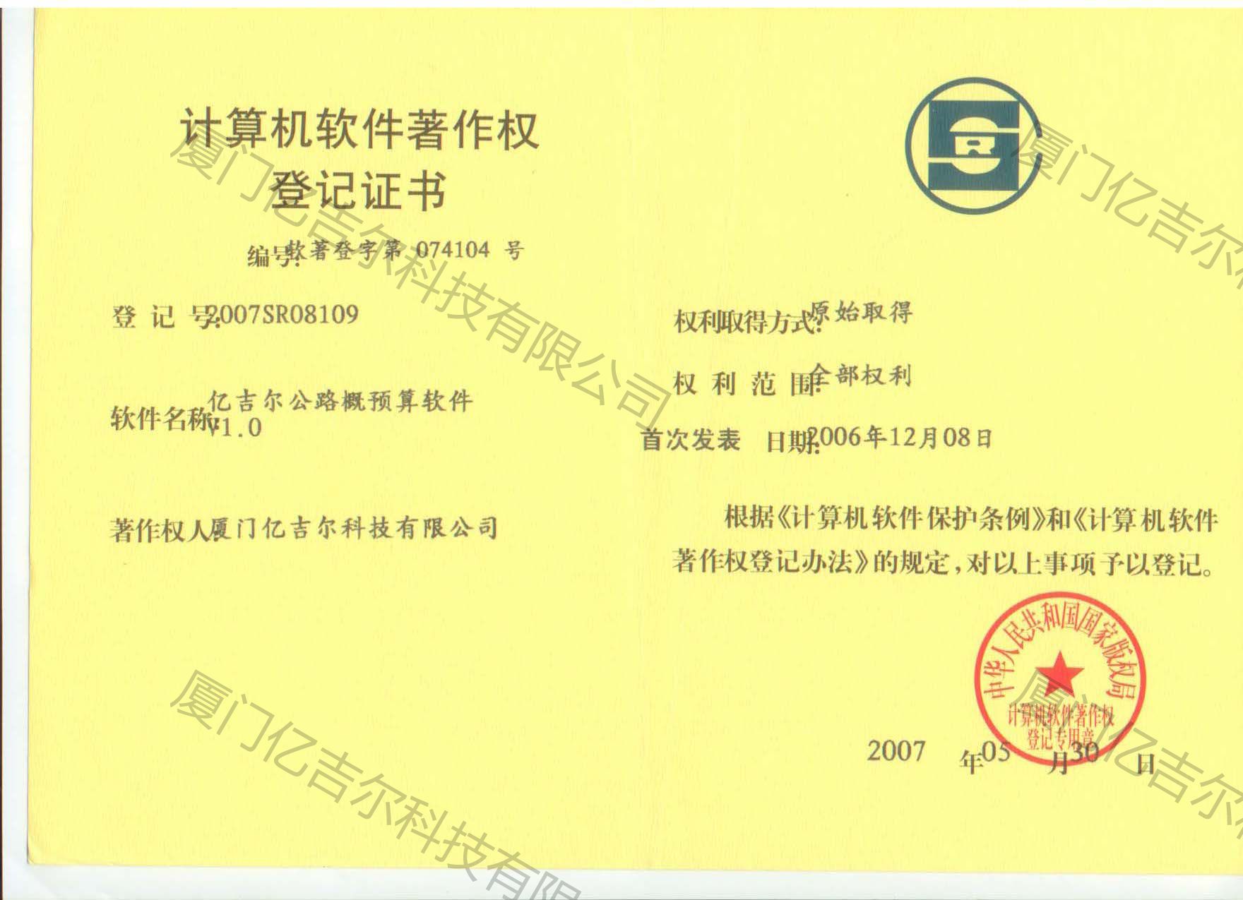 億吉爾公路概預(yù)算軟件著作權(quán)登記證書 發(fā)布日期:2007年05月30日 瀏覽次數(shù):3597 關(guān)鍵字: 公司 1/1億吉爾公路概預(yù)算軟件著作權(quán)登記證書
